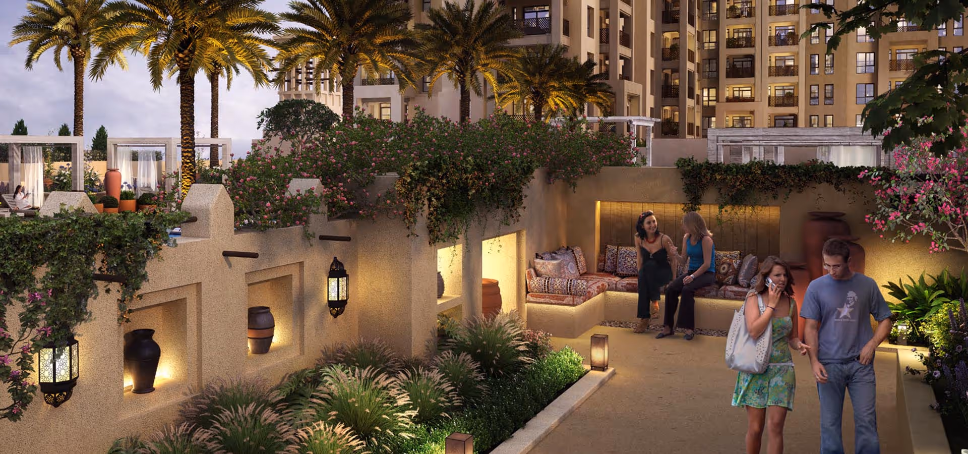 Freehold resort-style community by Meraas, 900 m from Burj Al Arab, with 3,500+ low-rise apartments blending Arabic design and modern luxury.