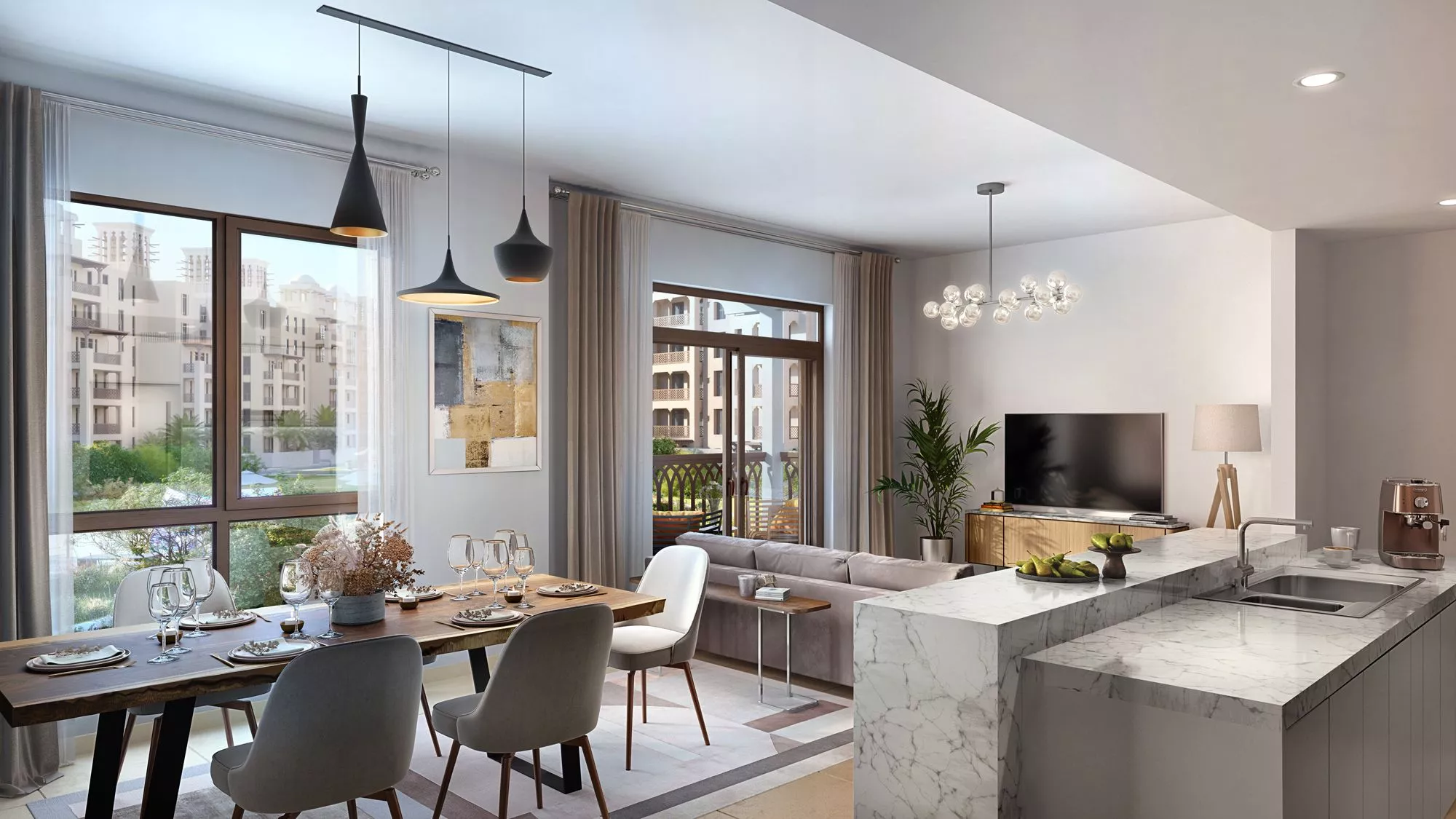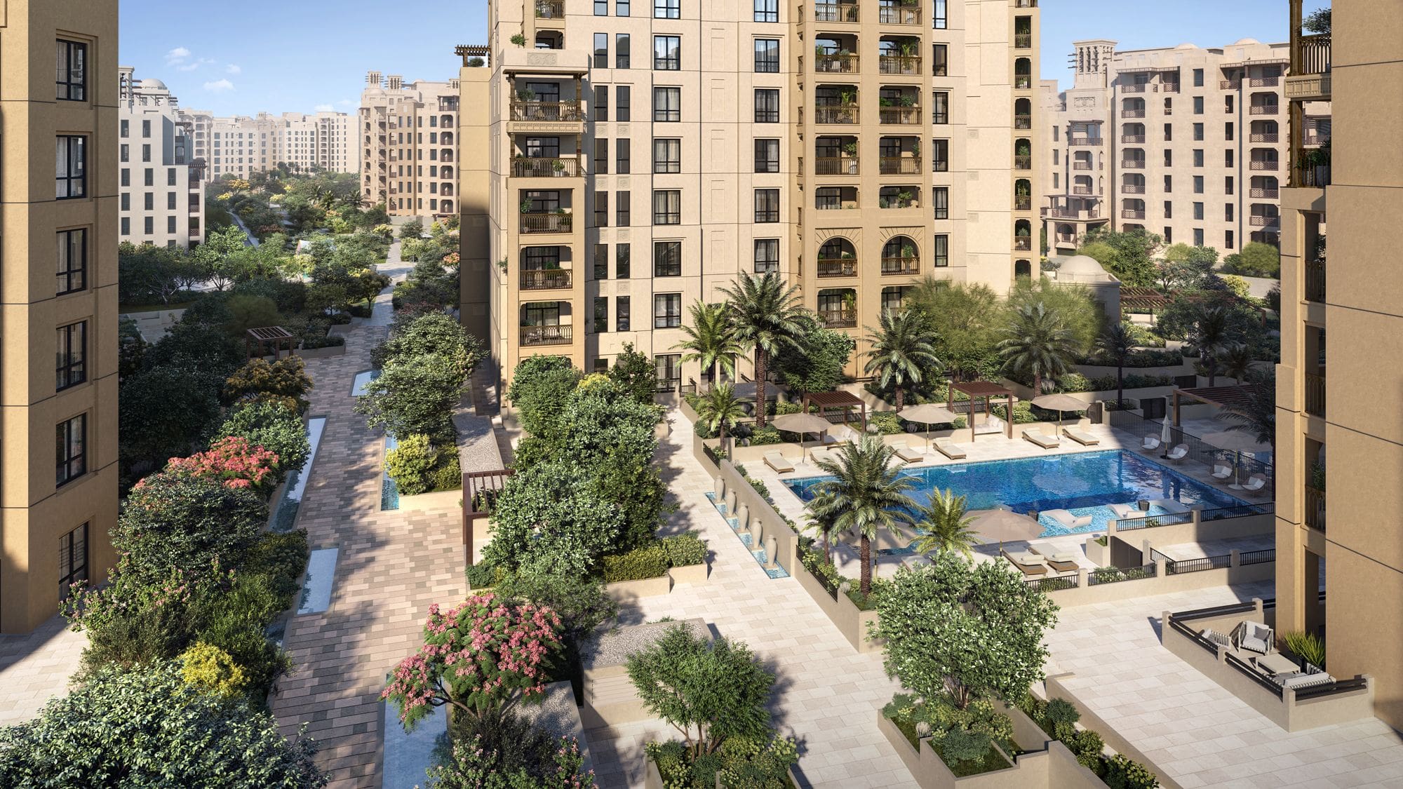 Through jogging and cycling lanes, playgrounds, several swimming pools, gyms, and covered pathways, Jadeel's 33,700 sqm of green spaces provide an active lifestyle. Tailored amenities in proximity to Jumeirah Beach, Souk Madinat, and first-rate hotel amenities are enjoyed by residents.